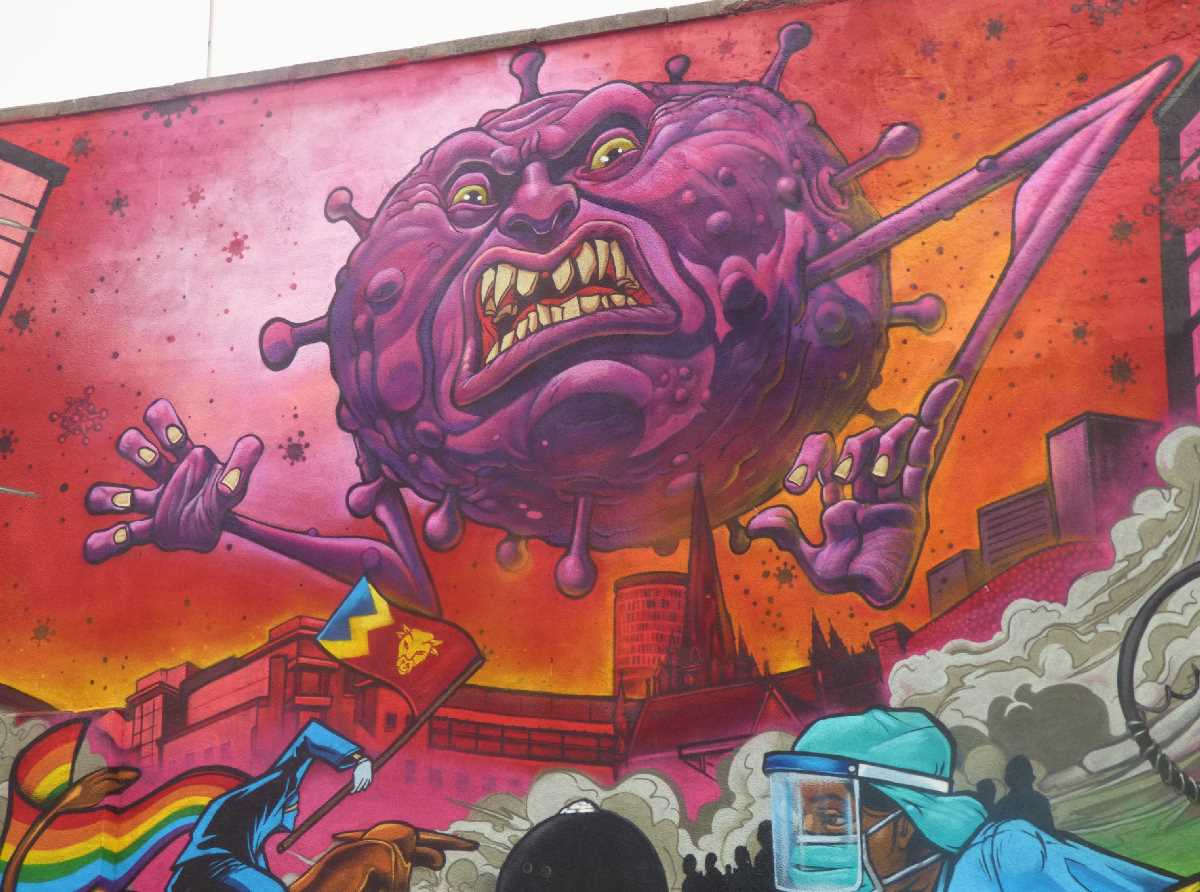 "the artwork demonstrates that the City of Birmingham does indeed move ‘Forward In Unity’. This epic depiction is of the City’s NHS and frontline workers fighting back against the evil grasp of the virus that has taken hold of the social lives and economic wellbeing of the residents of Birmingham."